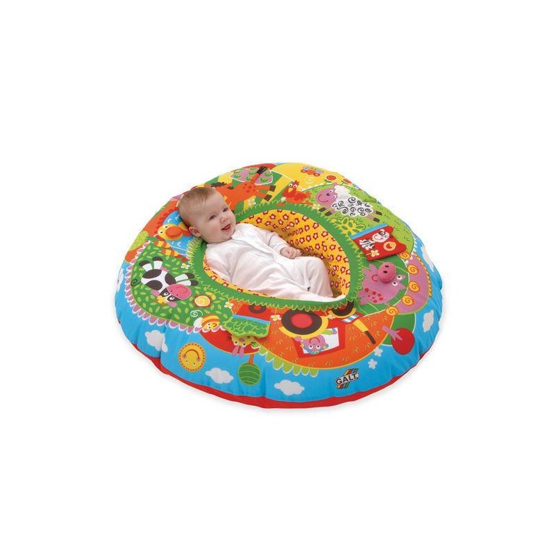 Anello gonfiabile con rivestimento in tessuto e 8 attività multisensoriali sul bordo. Rivestimento lavabile in lavatrice.