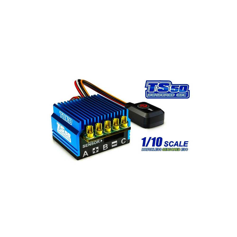 Toro TS50 ESC è un regolatore per motori brushless sensored con dimensioni ridotte, leggero, e con interruttore elettronico di accensione. Progettato per modelli 1/10 Buggy e auto Touring. Compatibile con batterie da 4 a 6S NiMH o 2S LiPo. BEC è 6V / 2A.
